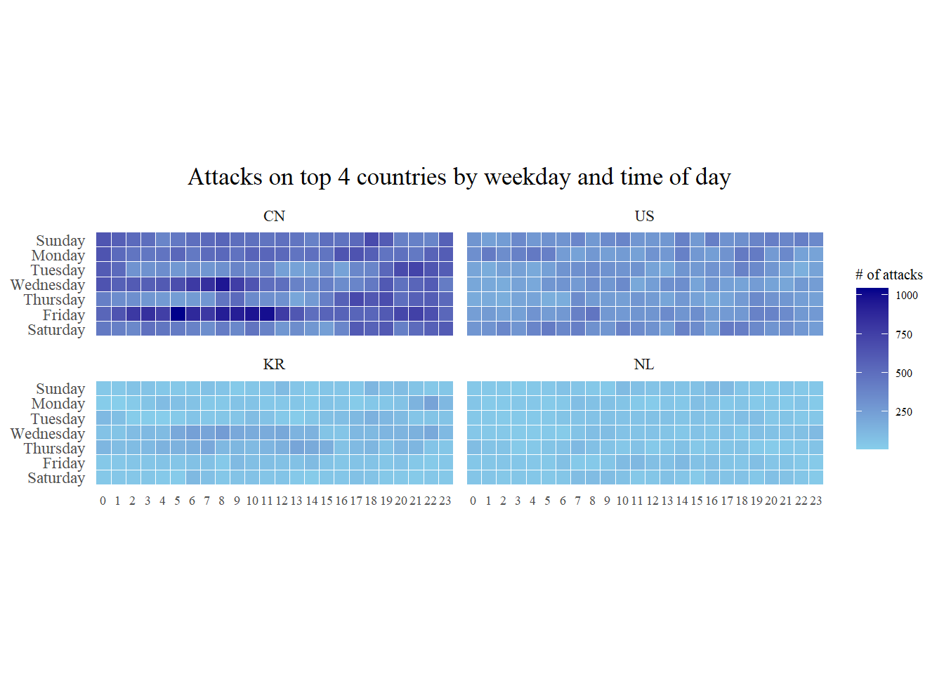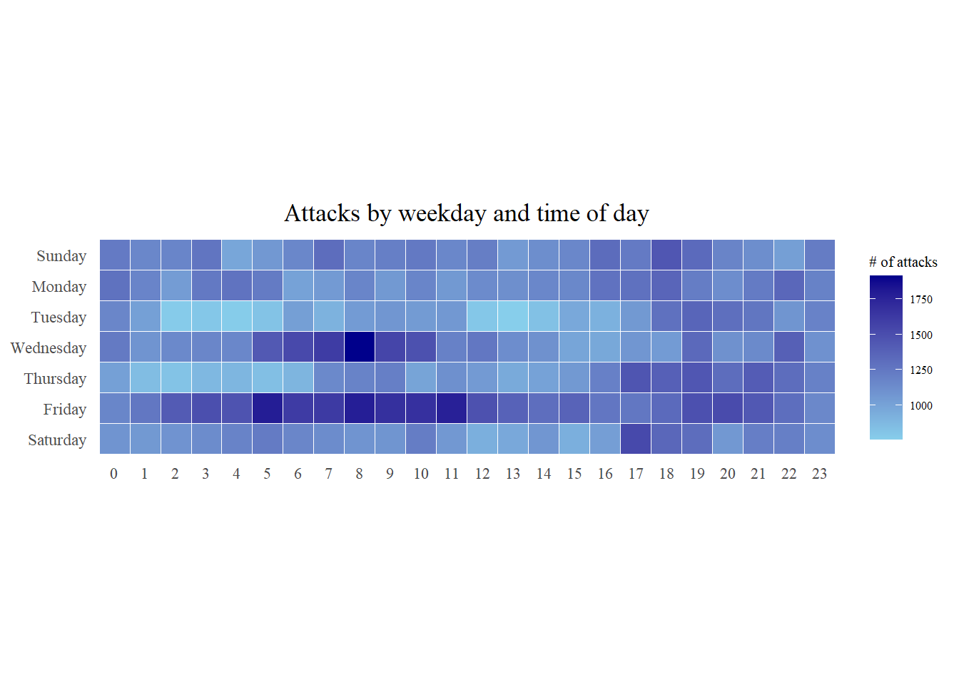 title = "Attacks by weekday and time of day") +