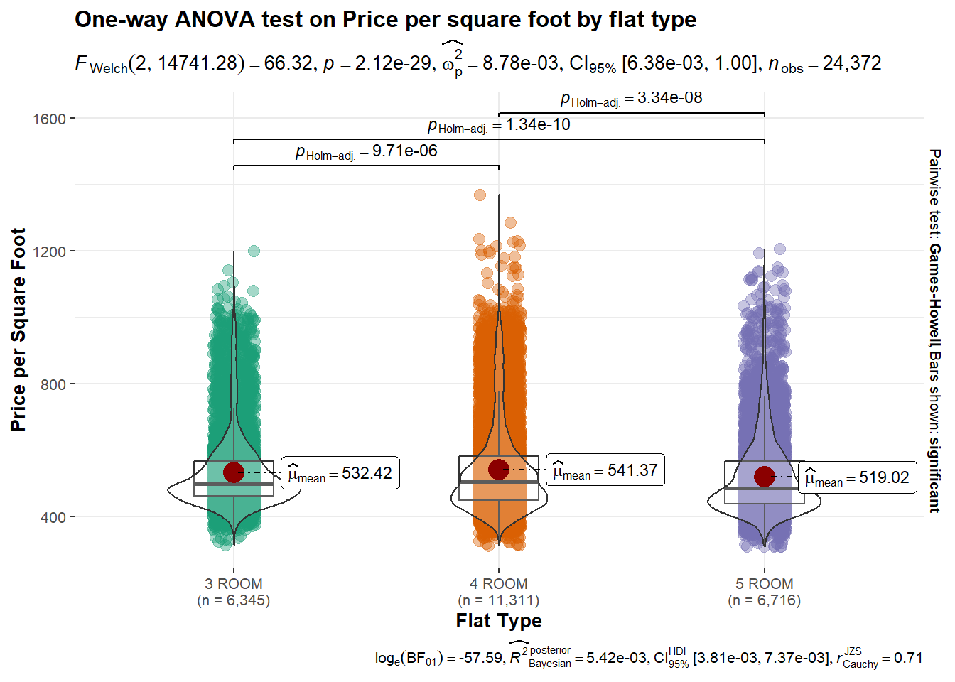 A common assumption is that larger units would have lower price psf. We can investigate if this is true, while examining the means and distributions of prices psf for each flat-type. We first compute price psf (using 1 sqm = 10.764 sqft), then use ggbetweenstats() to conduct a One-way ANOVA test on price psf by flat-type.